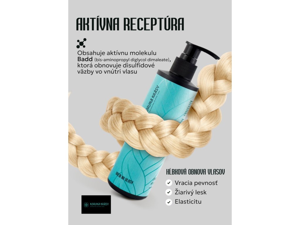 Kľúčovou zložkou je Bis-Aminopropyl Diglycol Dimaleate – unikátna molekula známa zo systému Olaplex, ktorá obnovuje disulfidové väzby vo vnútri vlasu. Vďaka tomu sa vlasy nielen chránia pred poškodením (farbenie, tepelná úprava, zapletanie), ale aj aktívne regenerujú, stávajú sa pevnejšími, pružnejšími a odolnejšími.
